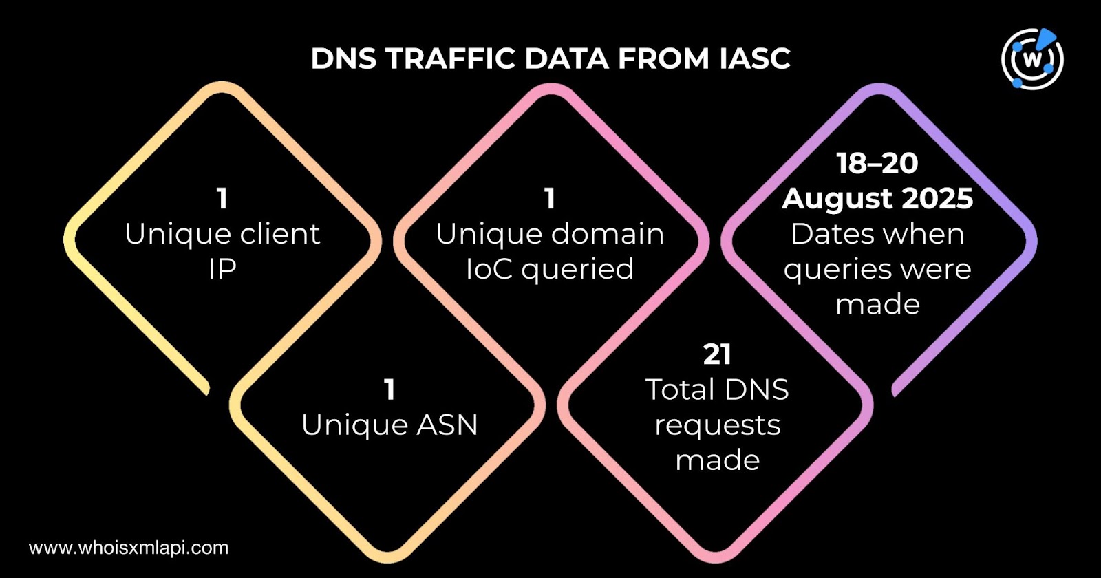 Sample network traffic data from IASC showed that one unique client IP address under one distinct Autonomous System number (ASN) queried one unique domain IoC via 21 DNS queries between 18 and 20 August 2025.