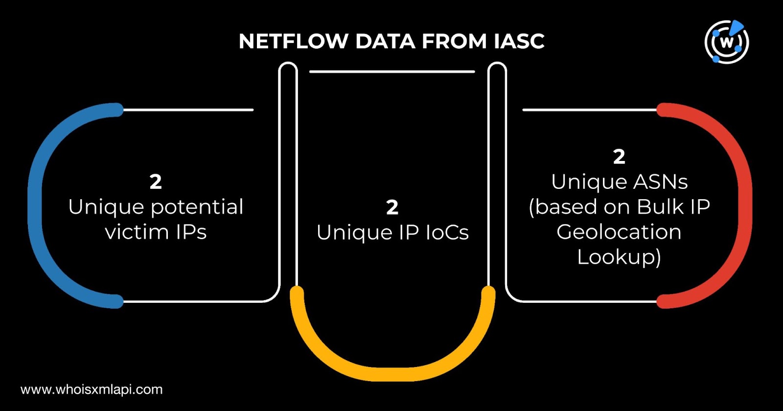 Sample network traffic IASC data also revealed that two unique alleged victim IP addresses communicated with two distinct IP IoCs under two unique ASNs based on the results of a Bulk IP Geolocation Lookup query.