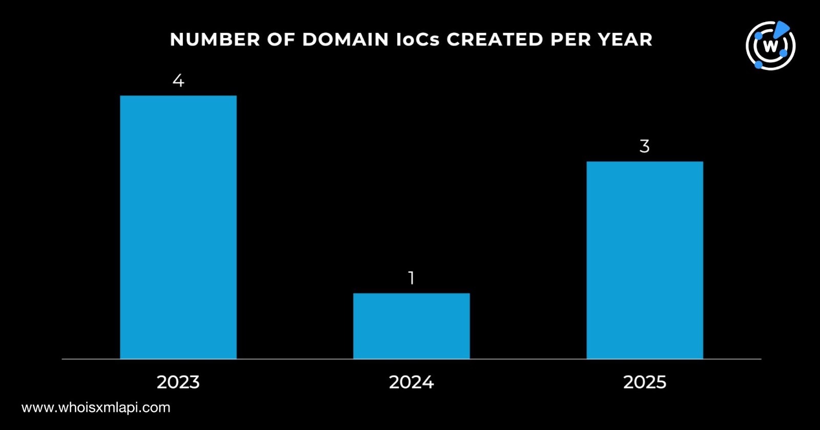 A query for the 19 domains tagged as IoCs on DNS Chronicle API revealed that all had rich DNS histories. They had 665 domain-to-IP resolutions over time since 5 February 2017. This indicates possible use for malicious campaigns between 2017 and 2025. Take a look at specific examples below.