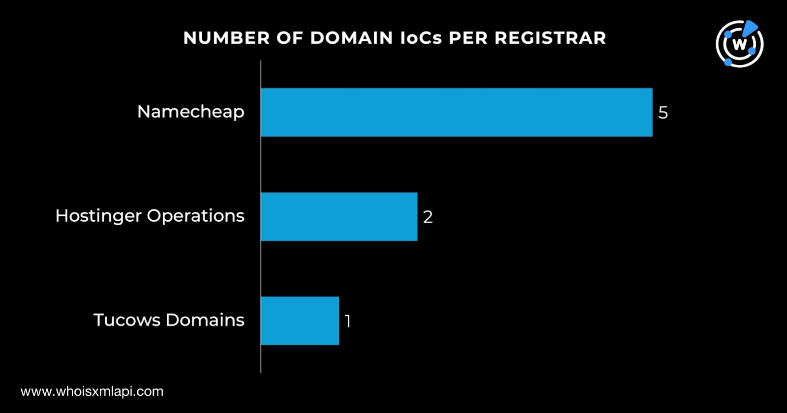 They were administered by three different registrars led by Namecheap, which accounted for five domain IoCs. Hostinger Operations took the second spot with two domains, followed by Tucows Domains with one domain in third place.
