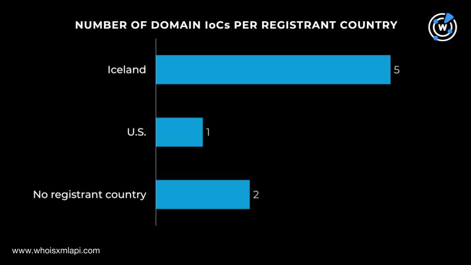 While two domain IoCs did not have registrant countries on record, the remaining six were registered in two countries. Five were registered in Iceland while one was registered in the U.S.