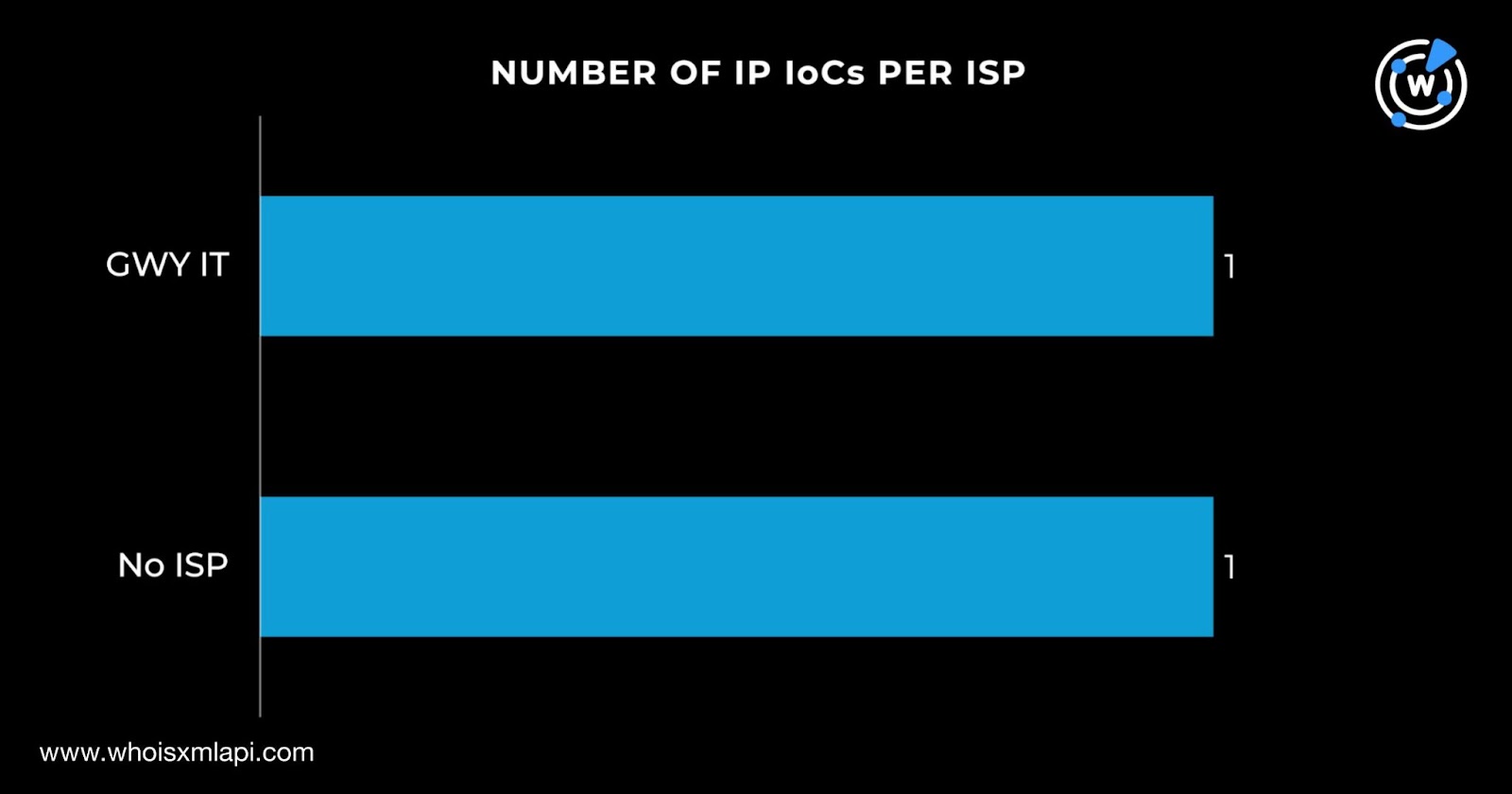 Next, we queried the two IP addresses tagged as IoCs on Bulk IP Geolocation Lookup and found out that while they were both geolocated in the U.S. (consistent with the list of registrant countries), only one had an ISP on record—GWY IT.