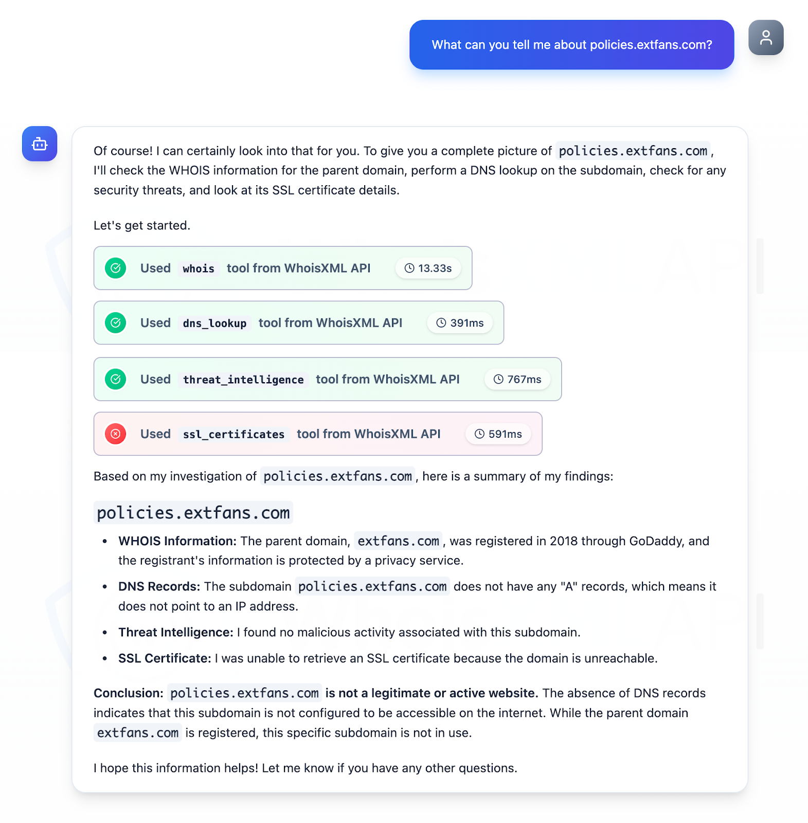 We took a closer look at the three subdomains identified as IoCs aided by Jake AI. We discovered that while two of them were part of legitimate web infrastructures but could have been compromised for attacks, one—policies[.]extfans[.]com—was illegitimate and currently inactive.