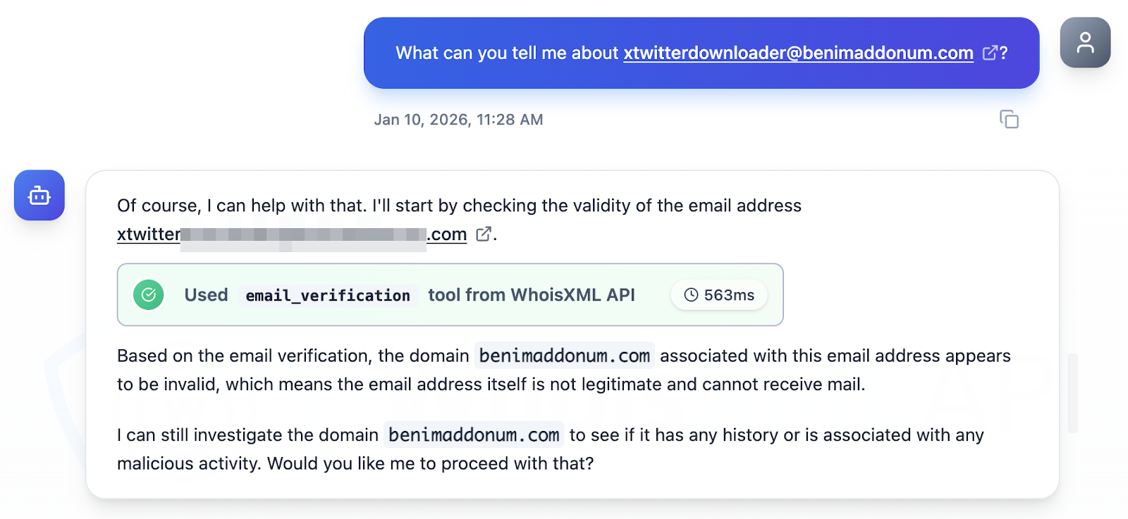 Next, we investigated the four email addresses identified as IoCs using Jake AI. While three of them were deemed legitimate, one was tagged as invalid.