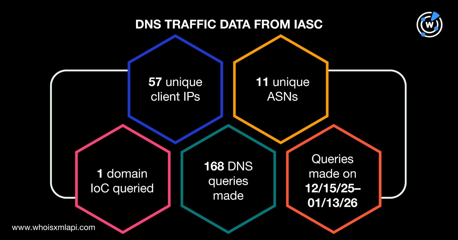 Sample network traffic data from the IASC revealed that 57 unique client IP addresses under 11 distinct ASNs communicated with one domain identified as an IoC via 168 DNS queries made between 15 December 2025 and 13 January 2026.