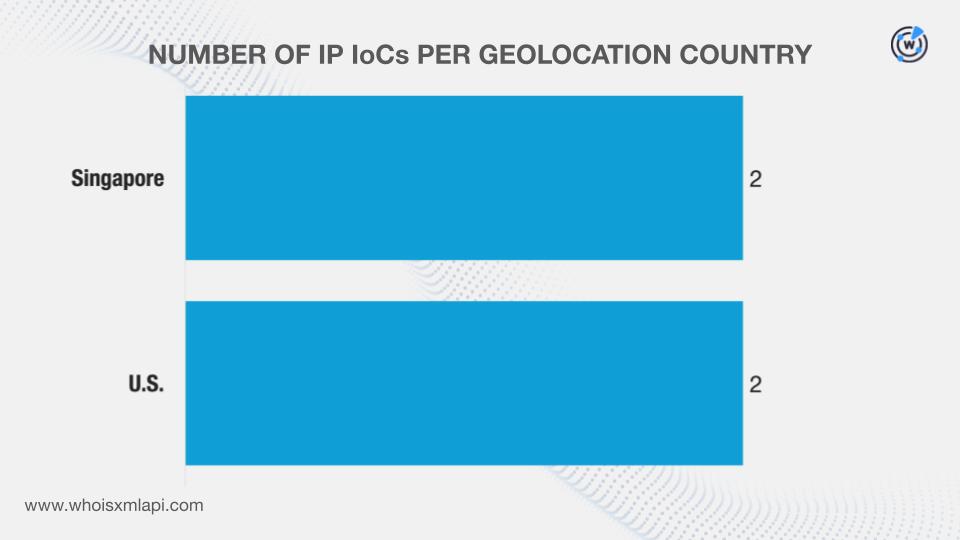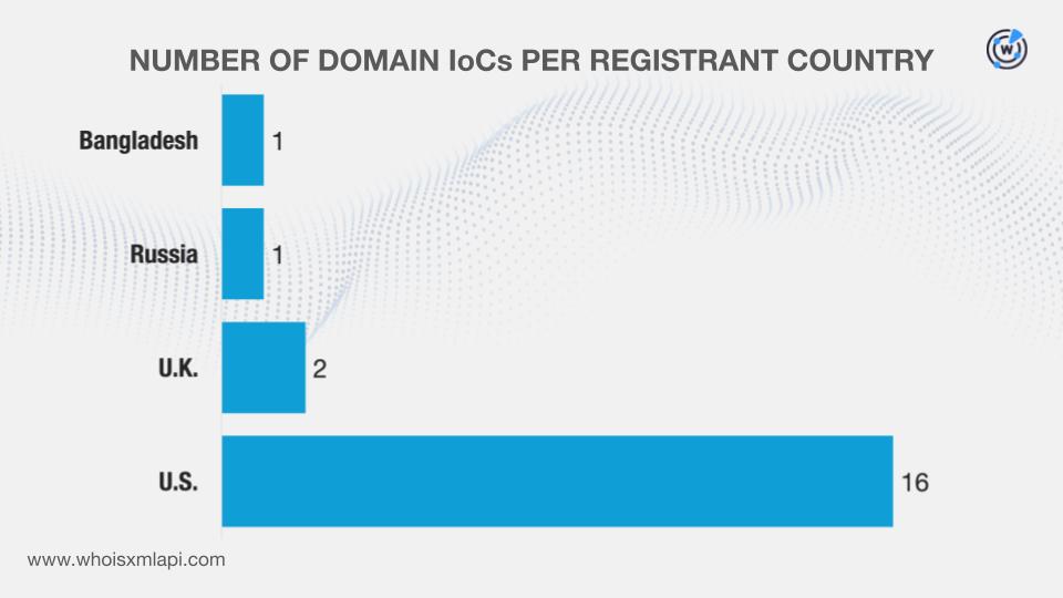 They were geolocated in two countries. Note that the U.S. was also named as the registrant country of several of the domains tagged as IoCs.