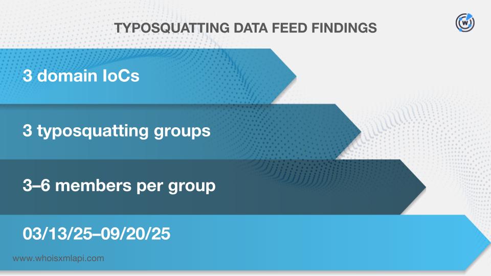 Our searches on the Typosquatting Data Feed revealed that three of the domains classified as IoCs appeared in three typosquatting groups with 3—6 members each (i.e., one IoC and 2—5 look-alikes). They were registered between 13 March and 20 September 2025.