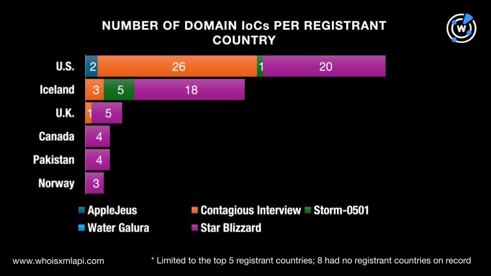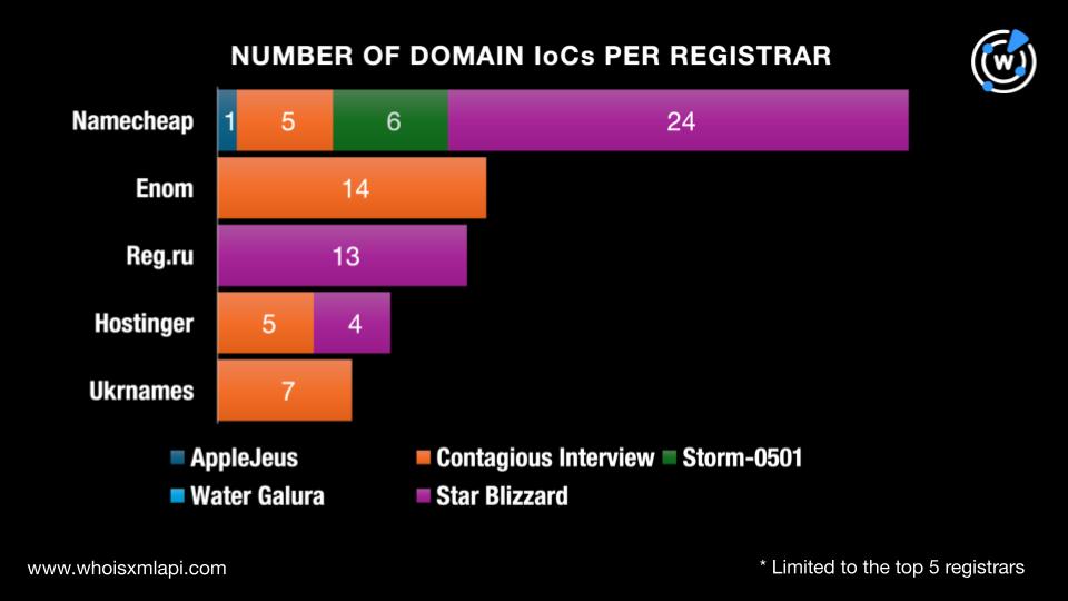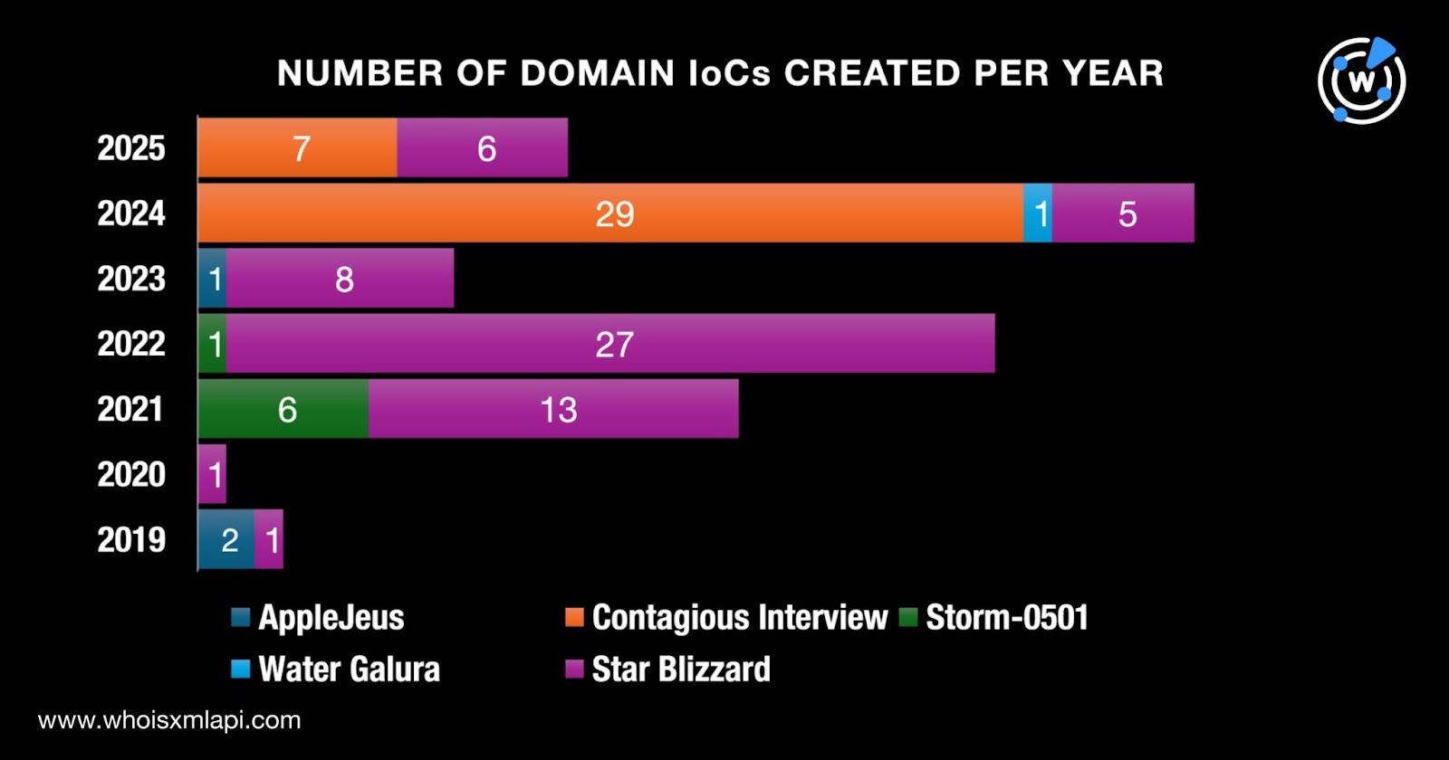 We compiled 126 domains as IoCs for five groups—AppleJeus, Contagious Interview, Storm-0501, Water Galura, and Star Blizzard. However, upon further checking via the WhoisXML API MCP Server, only 108 of the domains identified as IoCs were deemed suspicious or outright malicious. Take a look at more details below.