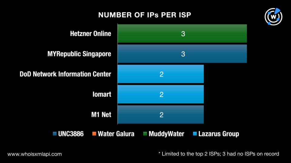 While three IP addresses did not have ISPs on record, the remaining 28 were administered by 21 ISPs. The top ISPs were Hetzner Online and MYRepublic Singapore, which tied in first place, accounting for three IP addresses each. Here is a volume breakdown by group.