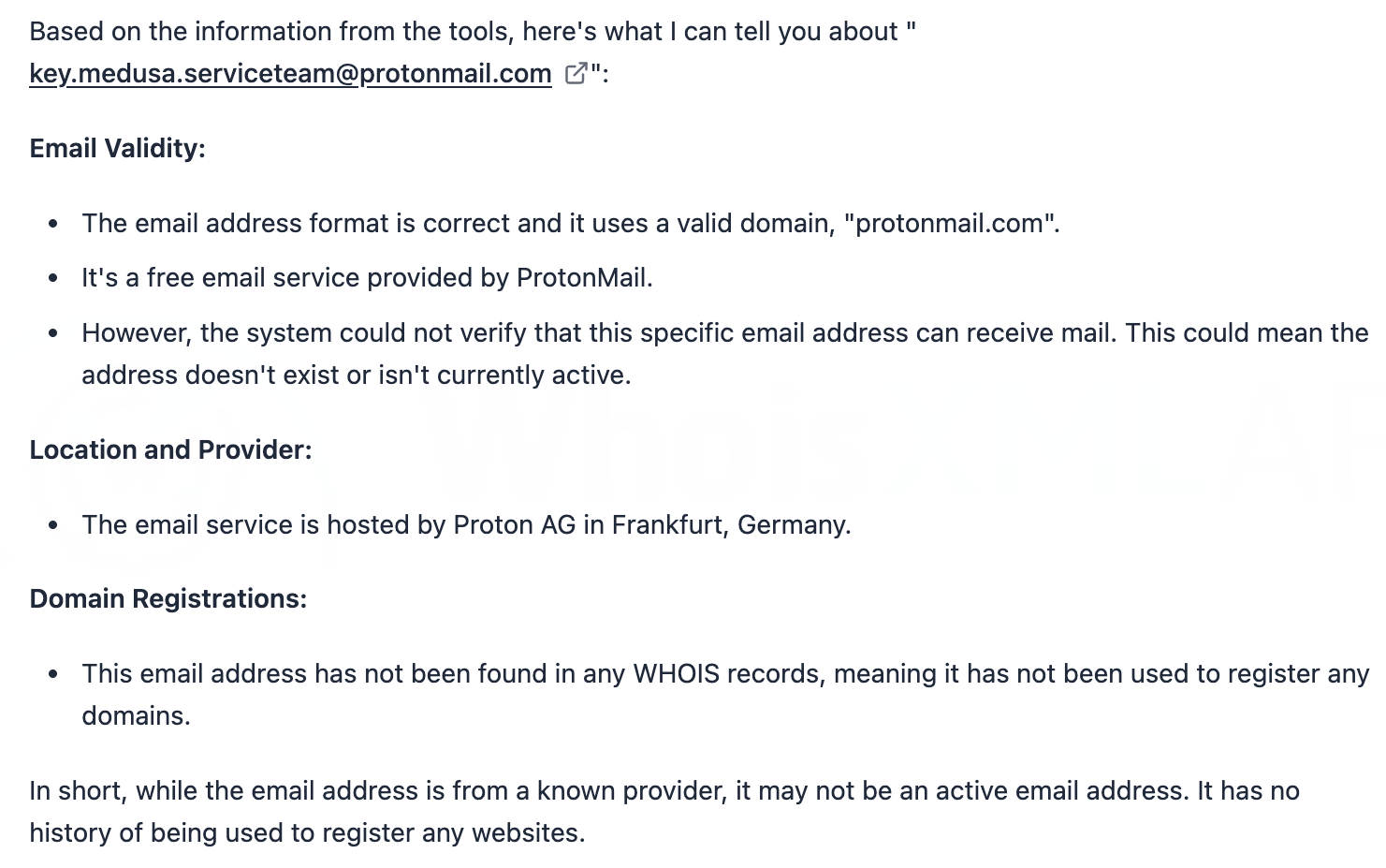 | key[.]medusa[.]serviceteam@protonmail[.]com | Valid Free email Does not exist or inactive | Not used to register any domain |