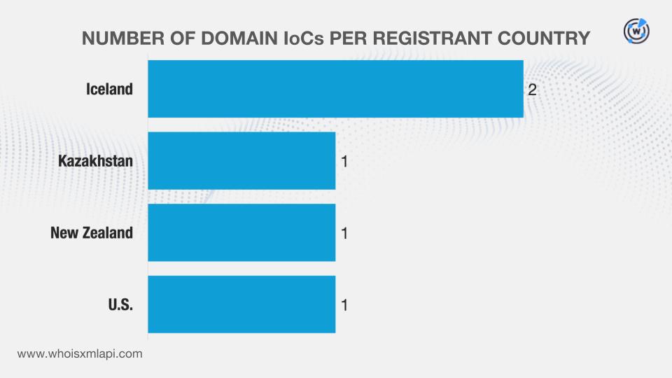 Reverse WHOIS API queries for the public email addresses led to the discovery of 86 unique email-connected domains after those already named as IoCs were filtered out.