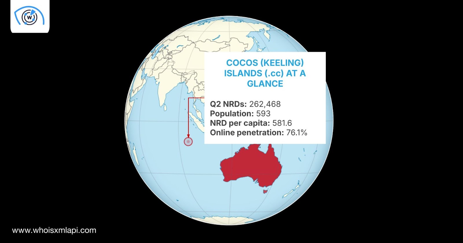 The Cocos (Keeling) Islands’ .cc ccTLD continued to register an NRD volume-to-population size incongruence for the third consecutive quarter. In particular, .cc accounted for 262,468 NRDs despite having only 593 residents and an online penetration rate of 76.1%. That translated to an NRD per capita of 581.6.