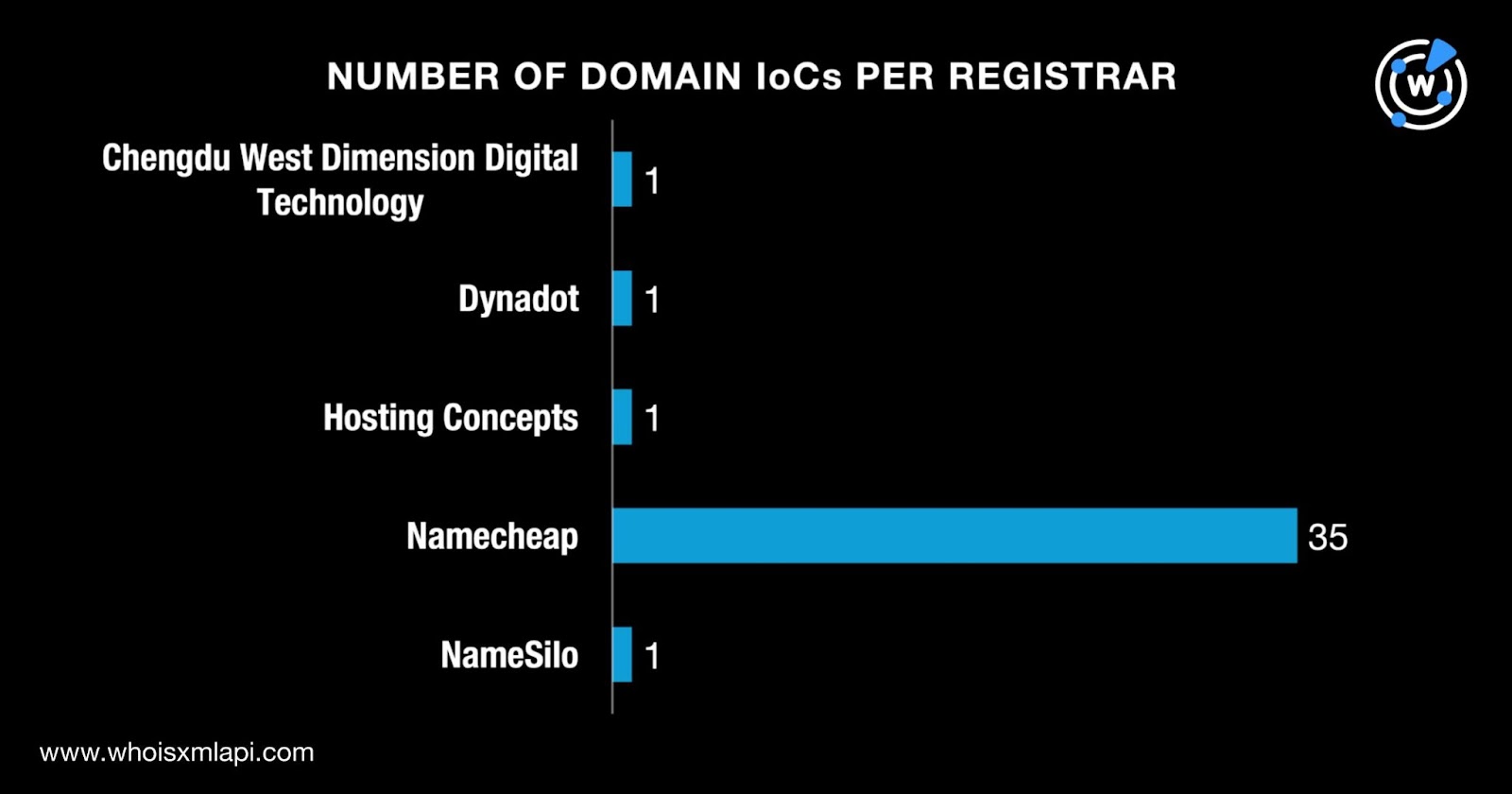 They were administered by five registrars led by Namecheap, which accounted for 35 domains. One domain each fell under the purview of Chengdu West Dimension Digital Technology, Dynadot, Hosting Concepts, and NameSilo.