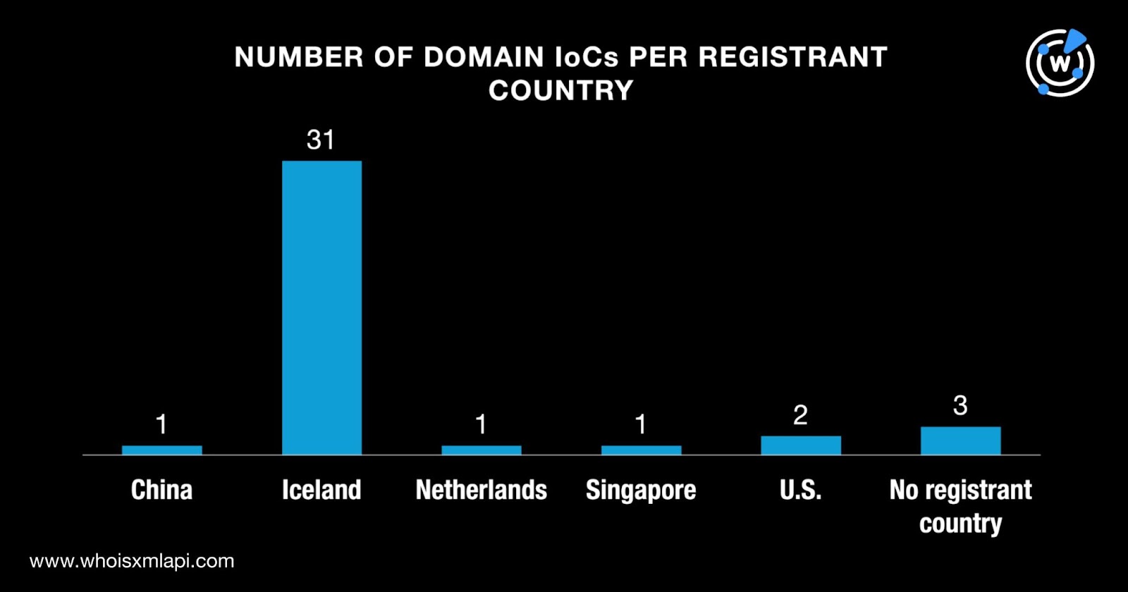 While three of the domains did not have registrant countries on record, the remaining 36 were split among five countries. Thirty-one domains were registered in Iceland; two in the U.S.; and one each in China, the Netherlands, and Singapore.