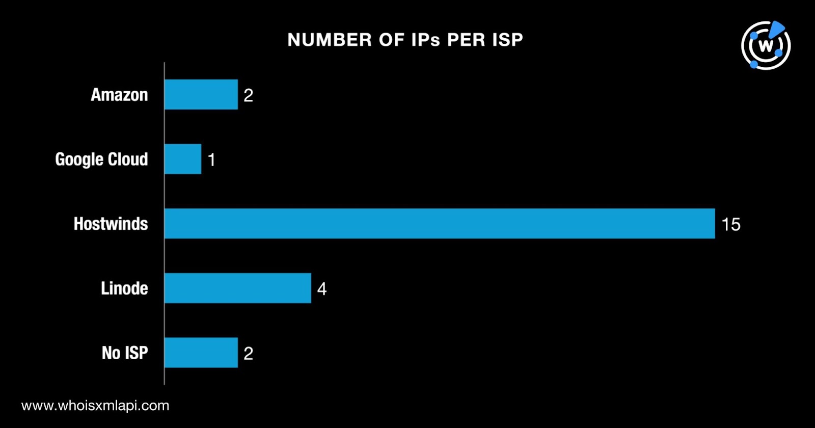 While two IP addresses did not have ISP data on record, the remaining 22 were distributed among four ISPs. Fifteen IP addresses were administered by Hostwinds, four by Linode, two by Amazon, and one by Google Cloud.
