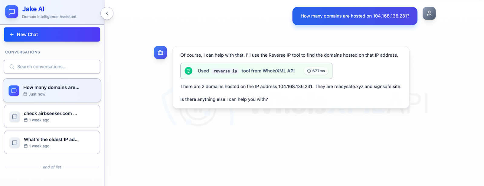 Next, we queried the 24 IP addresses on Jake AI to determine which could be dedicated hosts. We used the prompt “How many domains are hosted on 104.168.136.231?” for each IP address and discovered that 17 could be dedicated hosts.