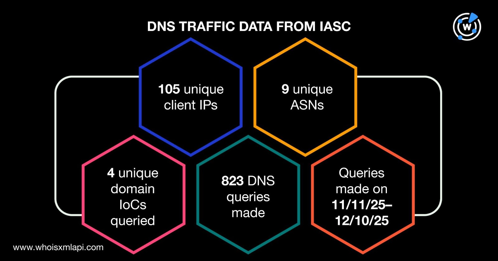 First, sample network traffic data from the IASC based on a total of 823 DNS queries showed that 105 unique client IP addresses under nine distinct ASNs communicated with four domains identified as IoCs between 11 November and 10 December 2025.