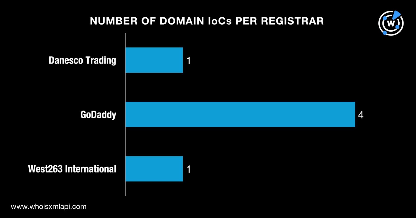 We then queried the six domains identified as IoCs on WHOIS API and discovered that: