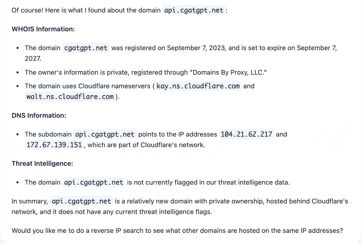 Koi identified seven IoCs comprising four domains and three subdomains. After extracting unique domains from the subdomains, we accumulated six domains and three subdomains for further analysis. Note that we queried the six domains on the WhoisXML API MCP Server and discovered that none of them were legitimate, making them worthy of further analysis.
