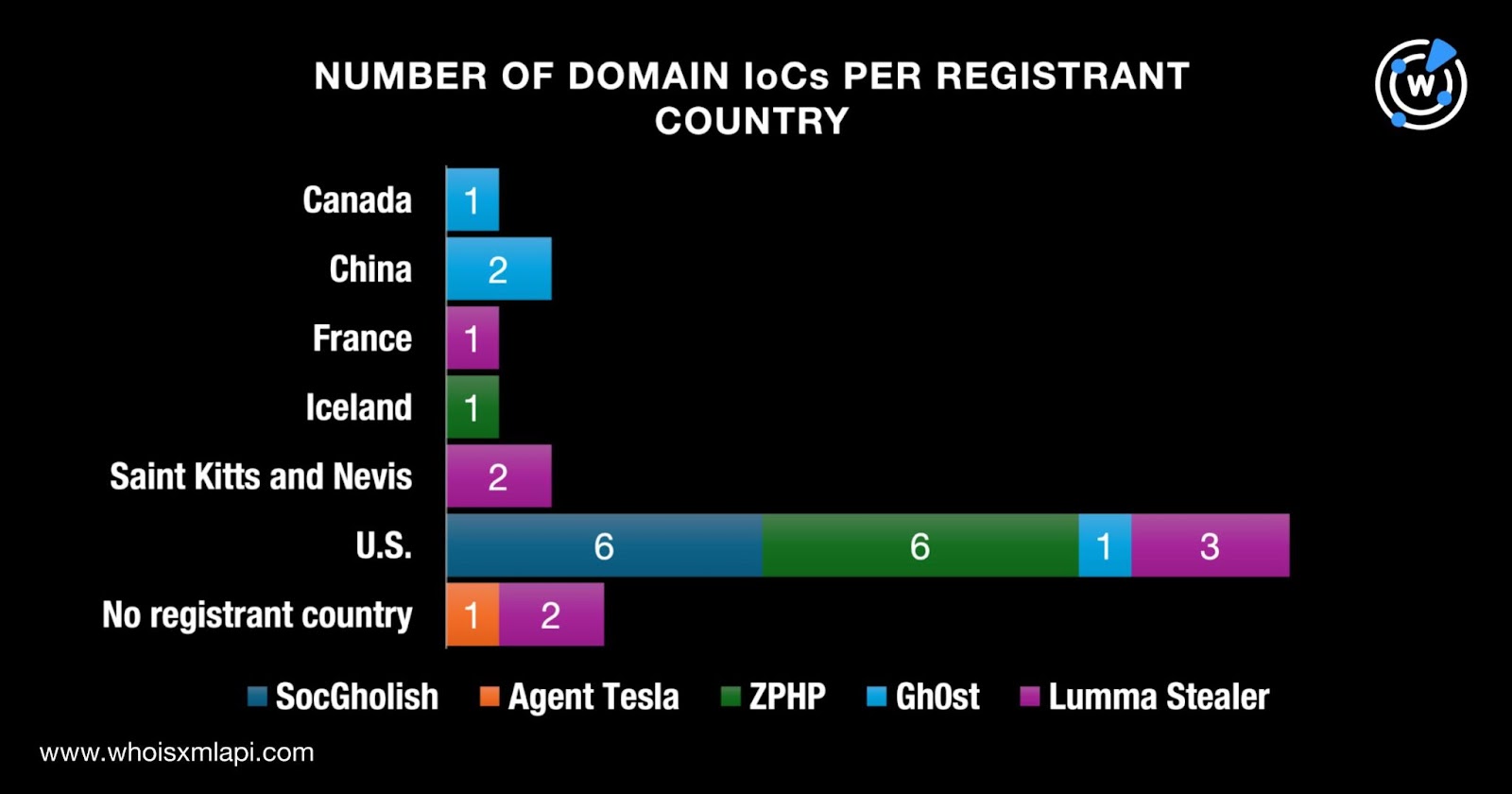 While three domains did not have registrant country data on record, the remaining 23 were registered in six countries. A total of 16 domains were registered in the U.S.; two each in China and Saint Kitts and Nevis; and one each in Canada, France, and Iceland.