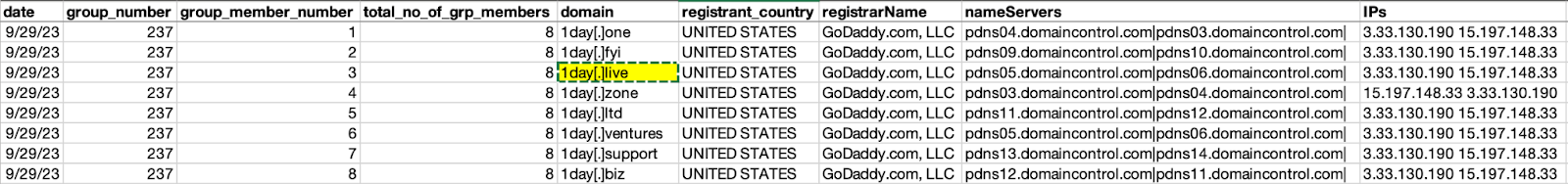 Upon closer scrutiny, we discovered that each group of domains had 3-8 domains each with one being an IoC. Take a look at a sample typosquatting group below with the IoC 1day[.]live.
