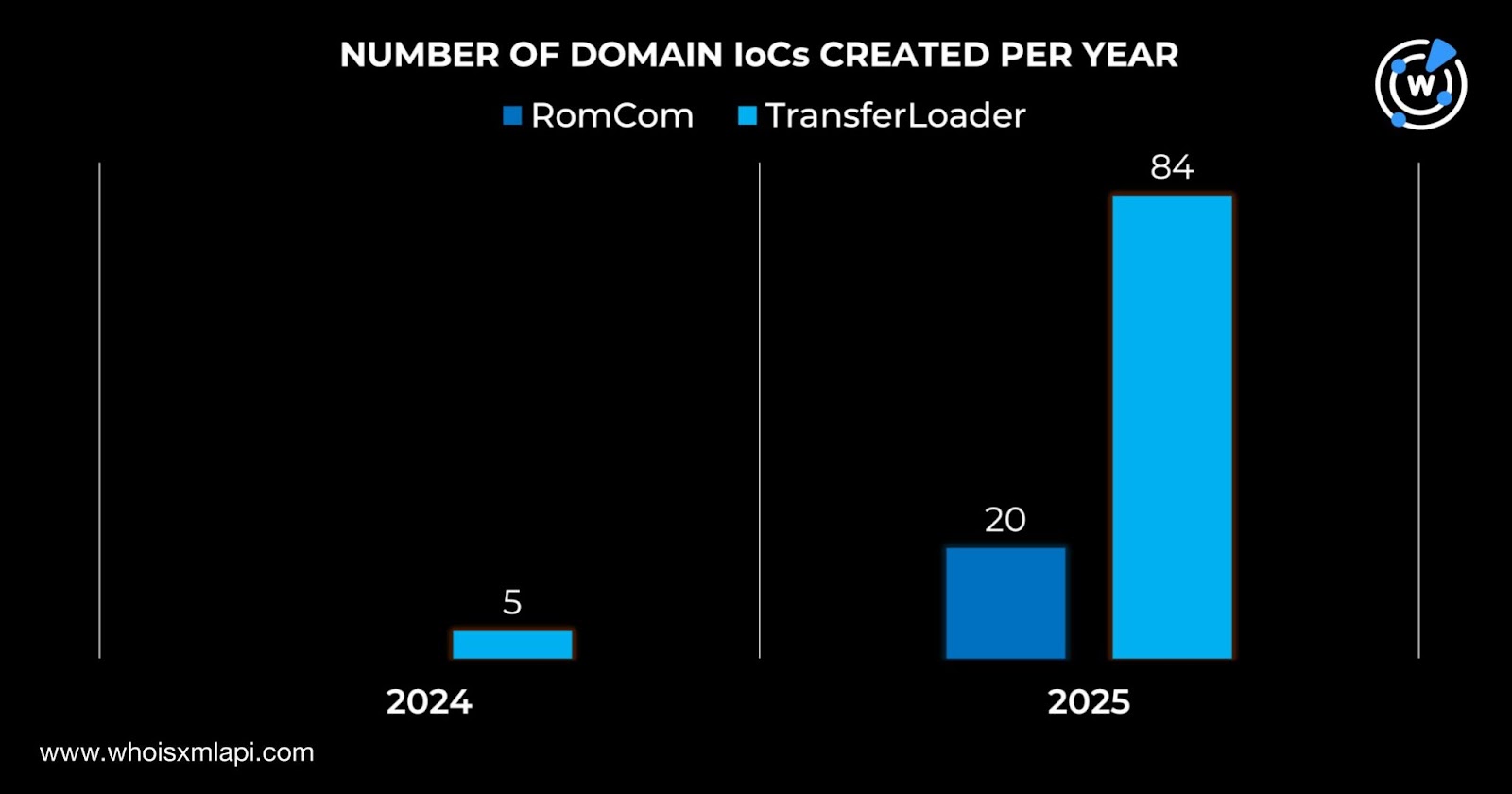 We started our search for connected artifacts by querying the 109 domains tagged as IoCs on Bulk WHOIS API and found out that they all had current WHOIS records. Upon closer examination, we discovered that they were likely fairly newly registered when they figured in attacks. Specifically, all of the 20 RomCom domains were created in 2025, specifically between 20 January and 11 June 2025. The 89 TransferLoader domains, meanwhile, were created between 2024 and 2025, particularly between 2 October 2024 and 14 April 2025.