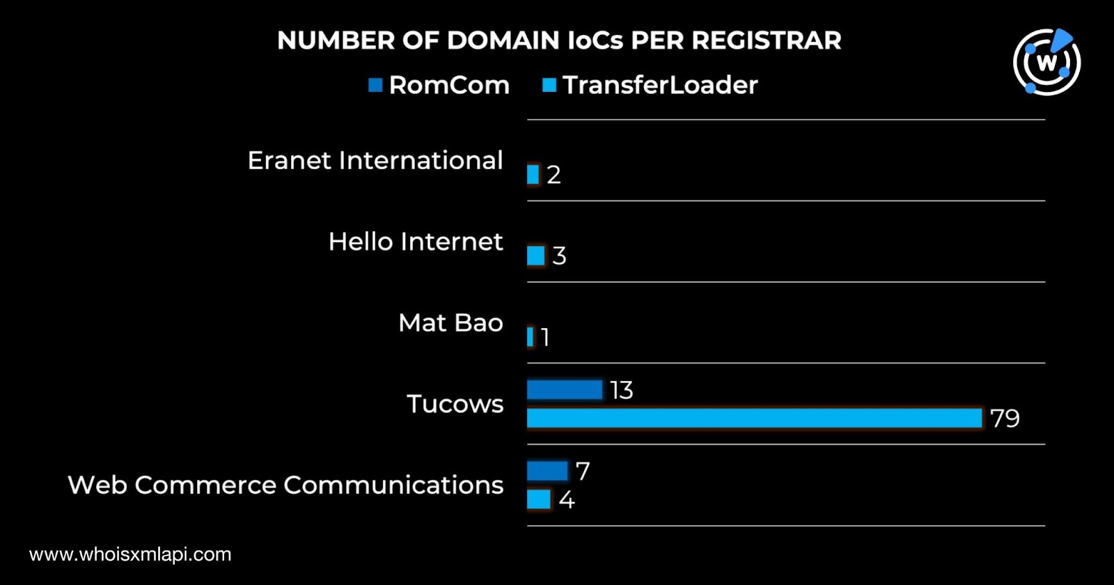 The 20 RomCom domains tagged as IoCs were split across two registrars—13 under Tucows and seven under Web Commerce Communications. The 89 TransferLoader IoCs, meanwhile, were administered by five registrars—79 by Tucows, four by Web Commerce Communications, three by Hello Internet, two by Eranet International, and one by Mat Bao.