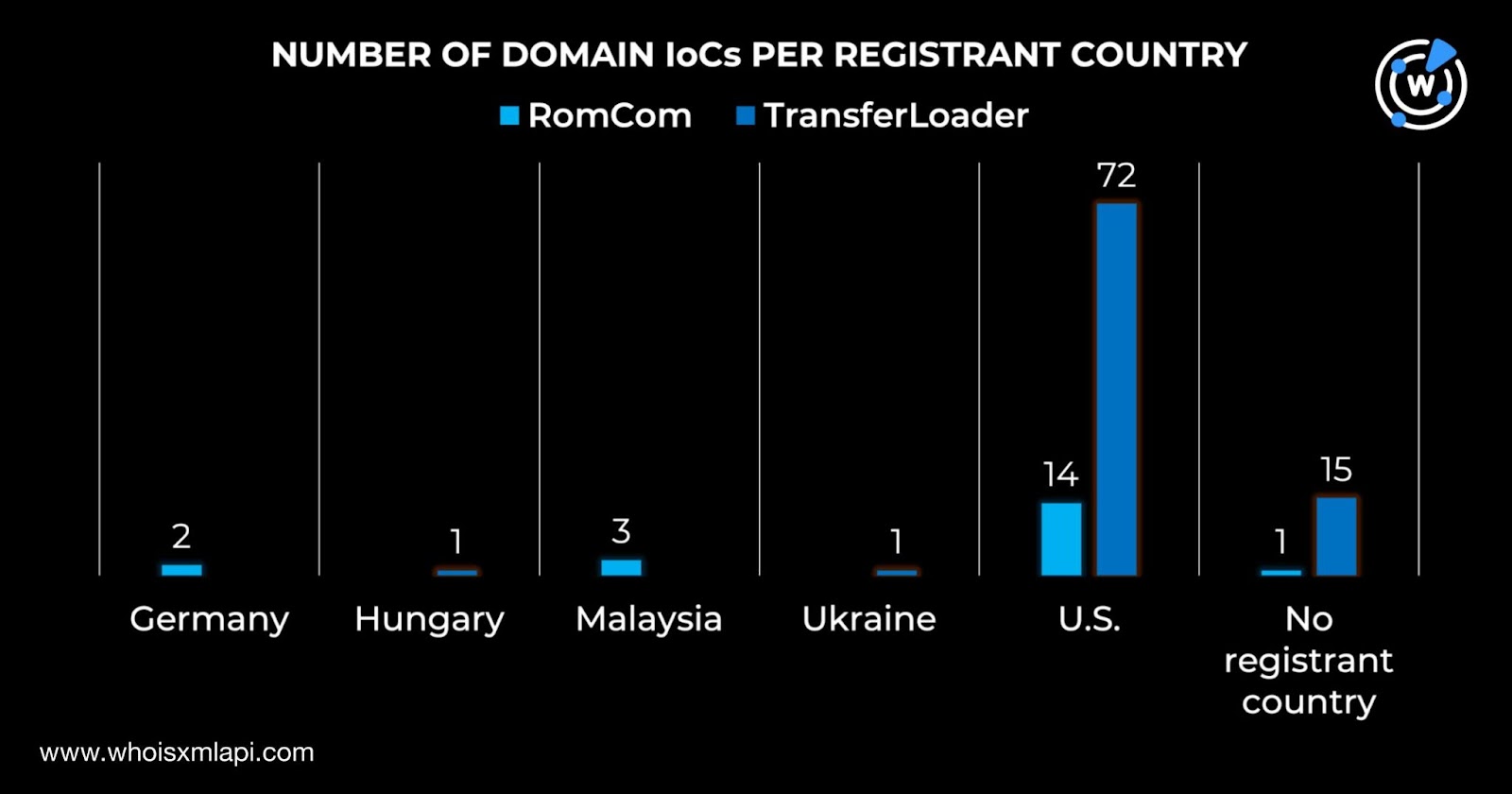 While one RomCom IoC did not have a registrant country on record, the remaining 19 were registered in three countries—14 in the U.S., three in Malaysia, and two in Germany. Fifteen TransferLoader IoCs did not have registrant countries on record as well. The remaining 74 were registered in three countries—72 in the U.S. and one each in Hungary and Ukraine.