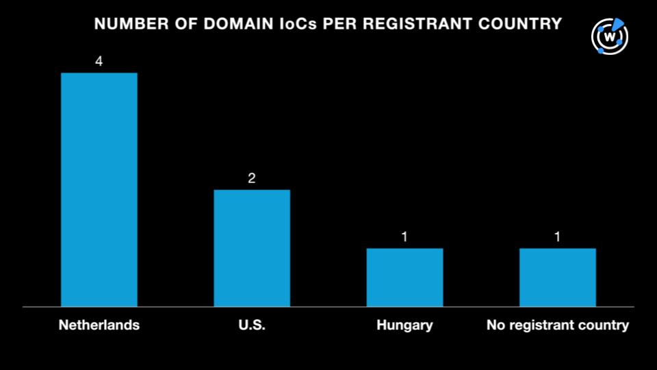 While one of the eight domains with current WHOIS records did not have a registrant country on record, the remaining seven were registered in three nations led by the Netherlands, which accounted for four domains. The U.S. accounted for two domains while the last one was registered in Hungary.