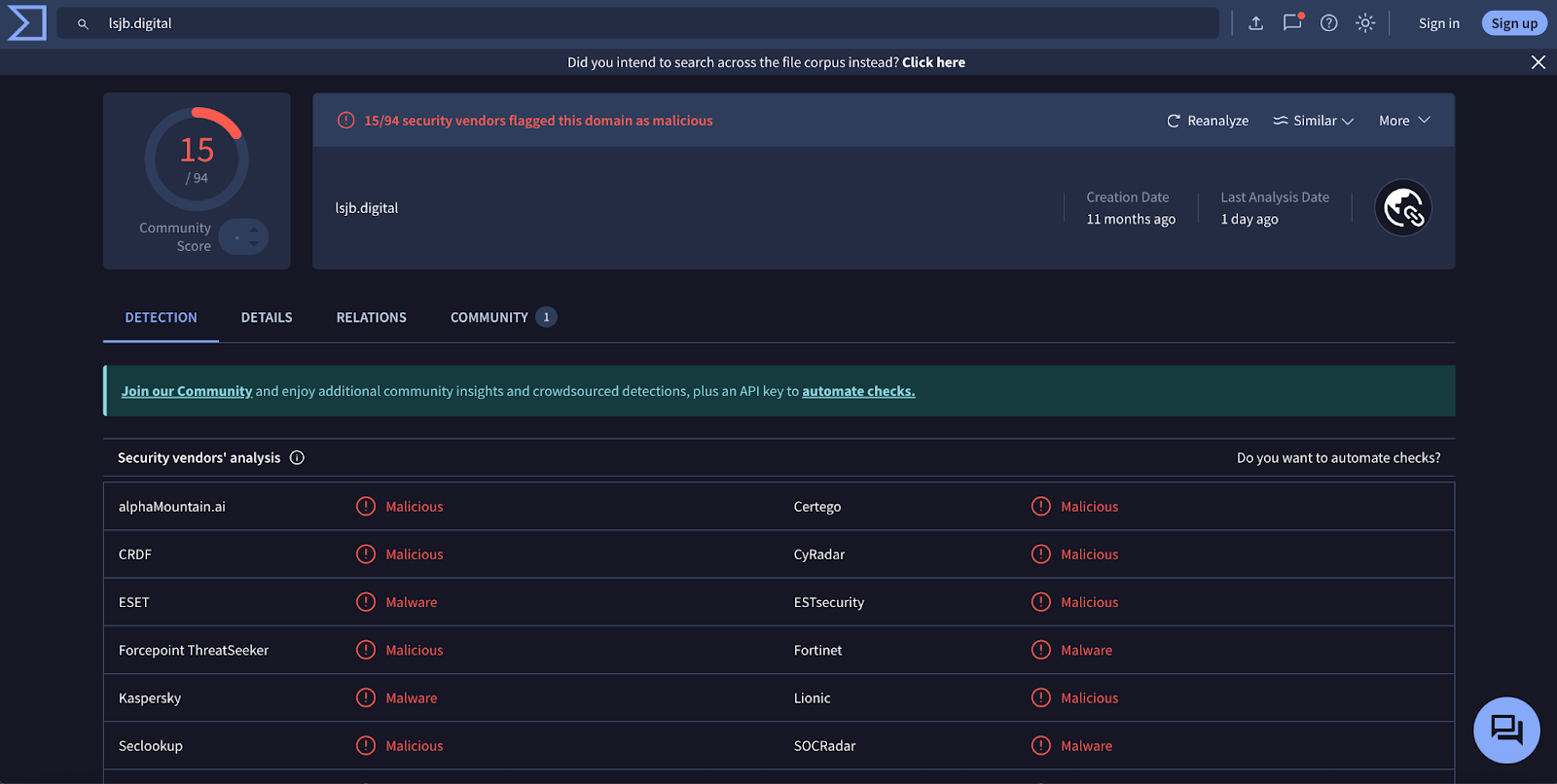 We also searched First Watch Malicious Domains Data Feed for the 10 domains identified as IoCs and discovered that lsjb[.]digital appeared as a domain likely to turn malicious on 1 July 2024, 318 days before it was classified as an IoC by ESET on 15 May 2025. Today, it is considered malicious by 15 out of 94 engines on VirusTotal.