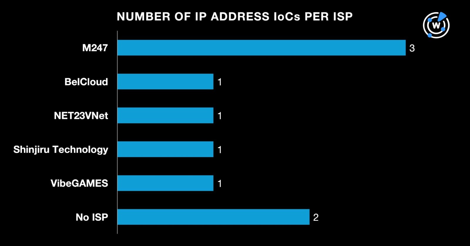 While two IP addresses did not have ISPs on record, the seven remaining ones were split among five ISPs led by M247, which accounted for three IPs. BelCloud, NET23VNet, Shinjiru Technology, and VibeGAMES administered one IP address each.