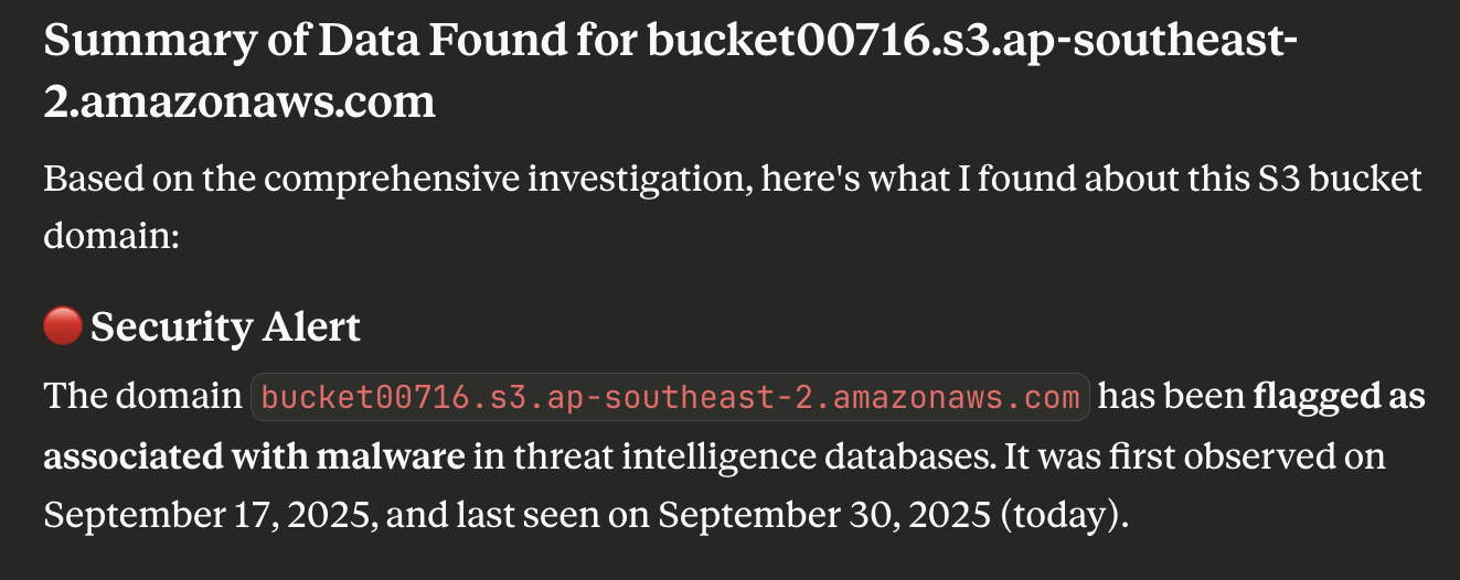 Our search for all the information our homegrown tools can find about bucket00716[.]s3[.]ap-southeast-2[.]amazonaws[.]com via the WhoisXML API MCP Server not only confirmed the subdomain’s malicious nature but also revealed that it was active between 17—30 September 2025.