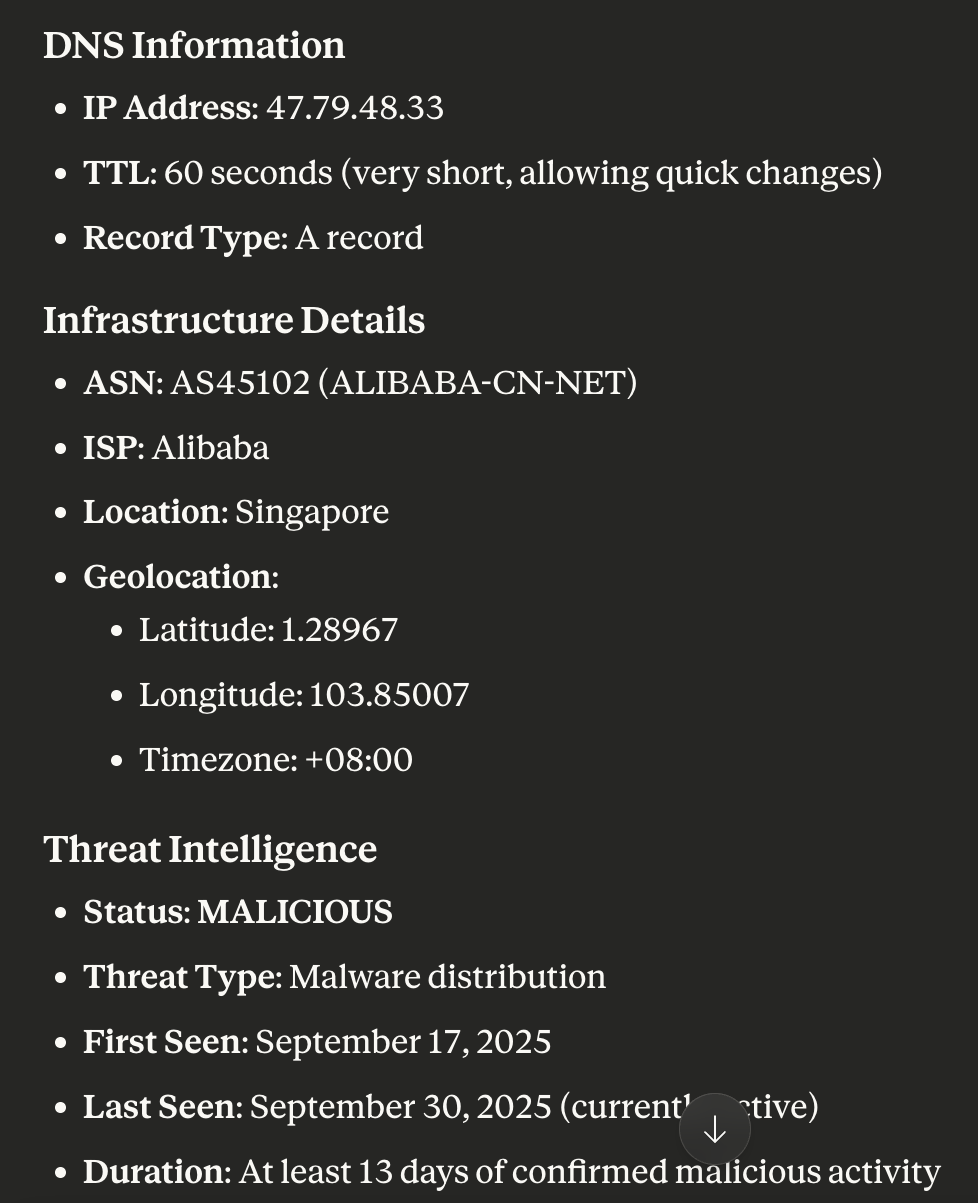 The WhoisXML API MCP Server told us that znrce3z[.]oss-ap-southeast-1[.]aliyuncs[.]com was also indeed malicious, has been active since 17 September 2025 to date, and has a short time-to-live (TTL) value—60 seconds.