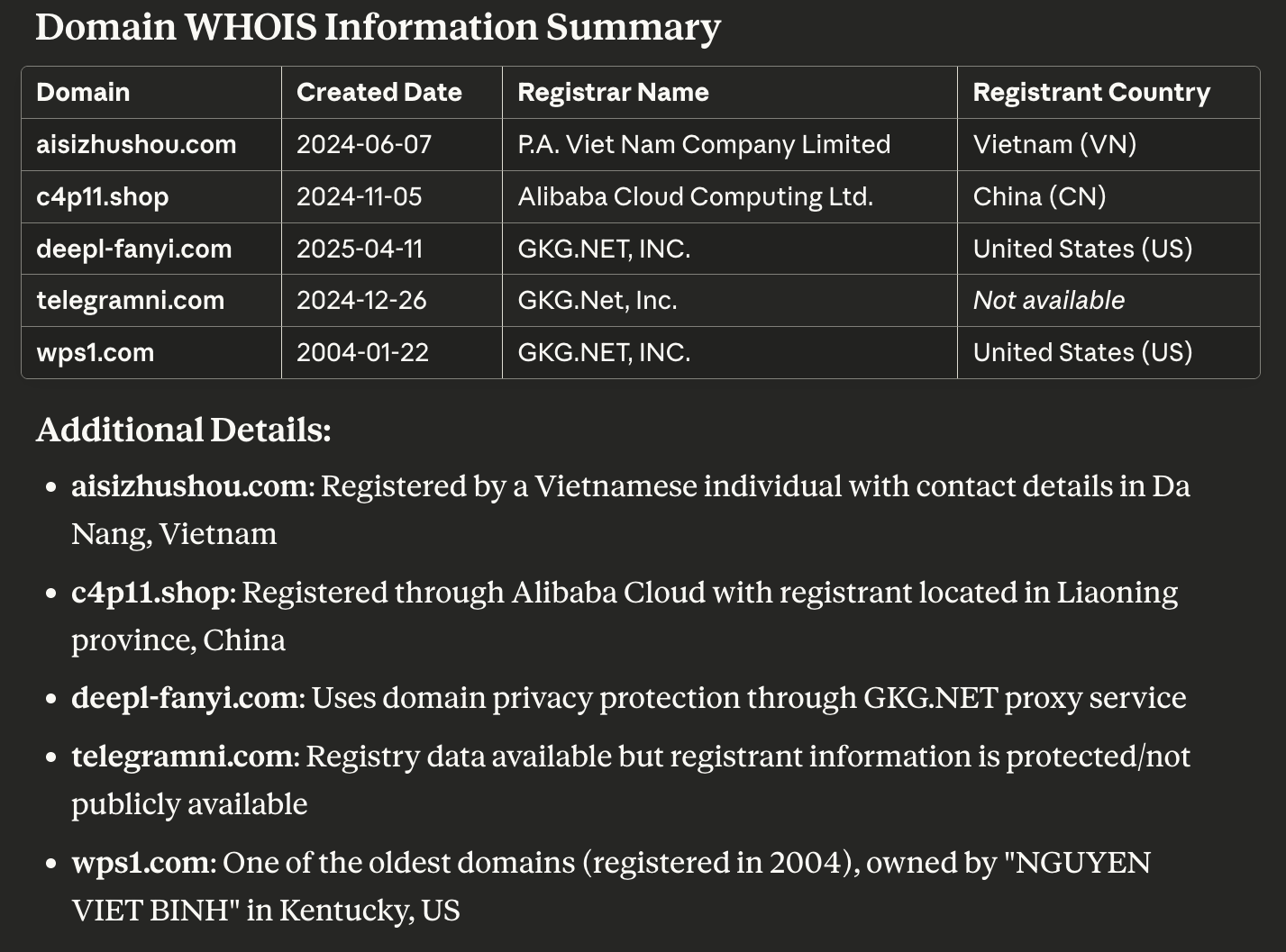 We began by querying the five domains identified as IoCs via the WhoisXML API MCP Server using the prompt “Get the createdDate, registrarName, registrant_country of aisizhushou.com, c4p11.shop, deepl-fanyi.com, telegramni.com, wps1.com using WHOIS API.”