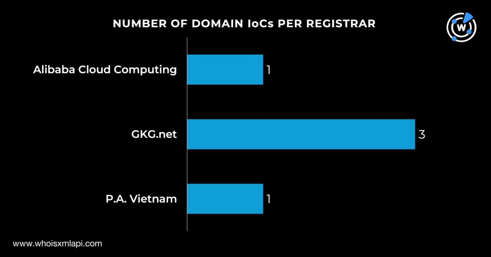 They were administered by three registrars—one by Alibaba Cloud Computing, three by GKG.net, and one by P.A. Vietnam.