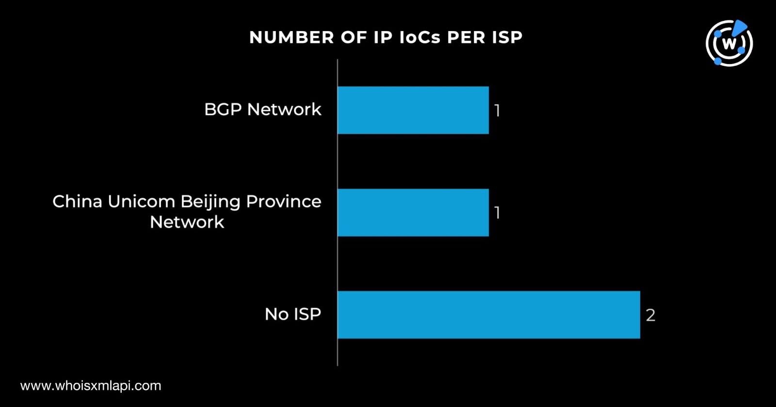 Next, we queried the five domains identified as IoCs on DNS Lookup API. We found out that they actively resolved to eight unique IP addresses, none of which were on the IoC list.