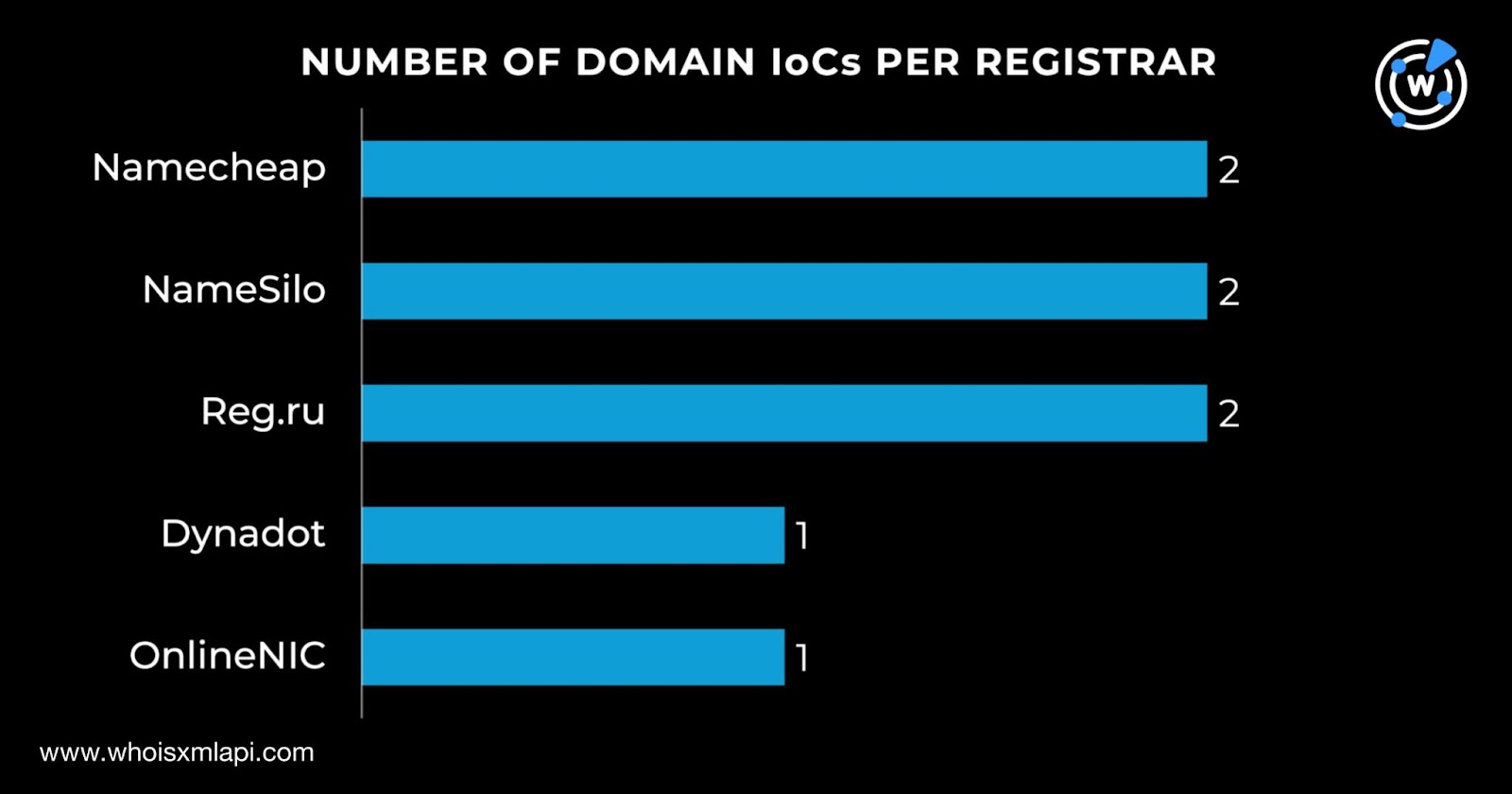 The eight domains were administered by five different registrars led by Namecheap, NameSilo, and Reg.ru, which handled two domains each. One domain each was managed by Dynadot and OnlineNIC.