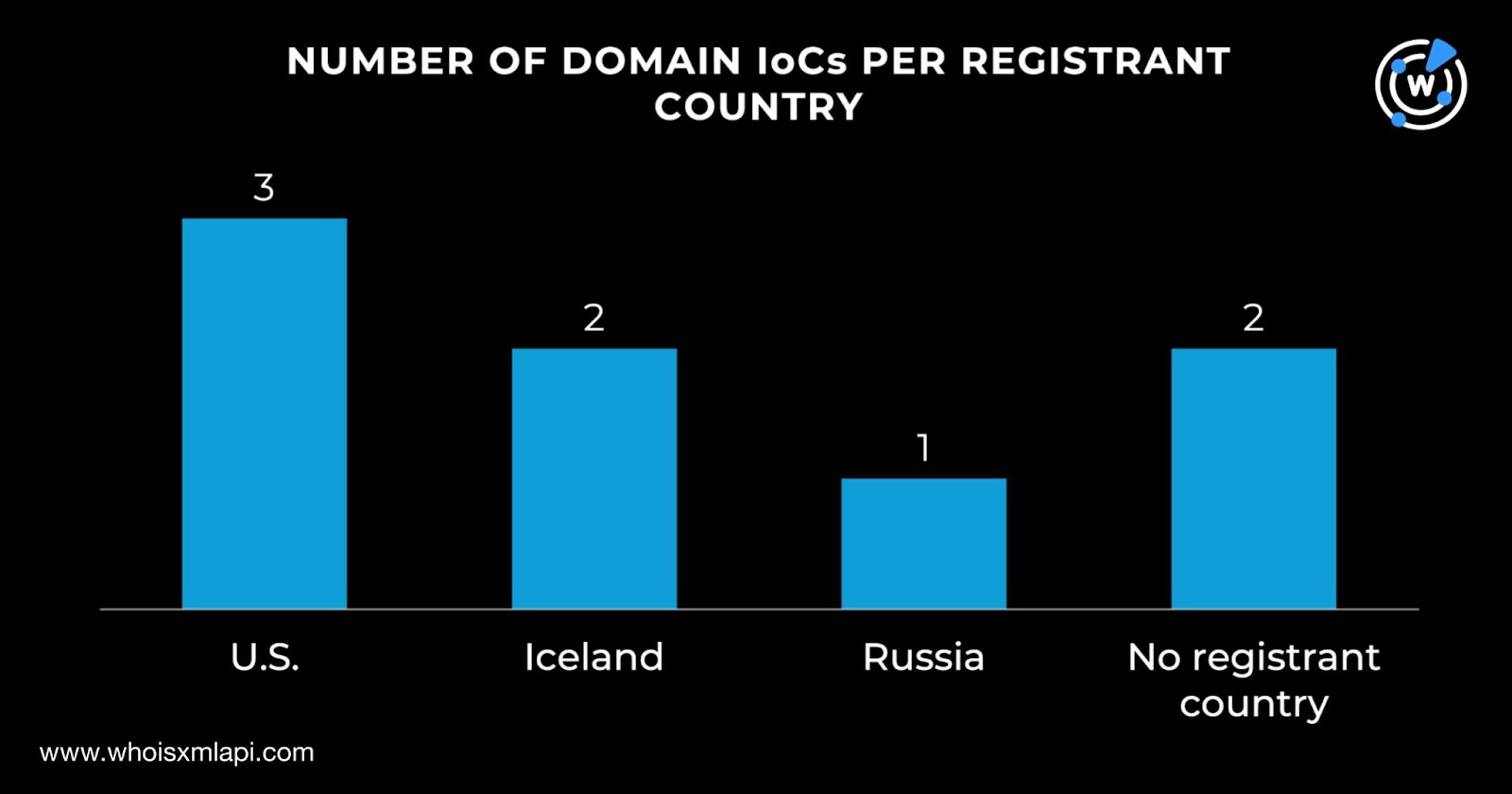 While two of the eight domains did not have registrant countries on record, the remaining six were registered in three different countries. The U.S. topped the list of registrant countries, accounting for three domains. Two domains were registered in Iceland, while one was registered in Russia.