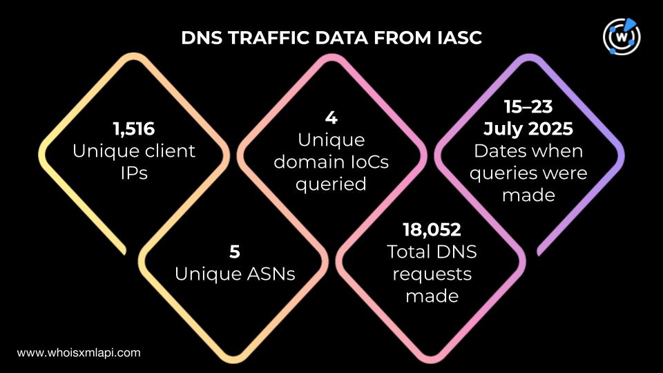 The DNS traffic data we obtained from IASC also showed that 1,516 unique client IP addresses tied to five unique Autonomous System numbers (ASNs) communicated with four of the domains identified as IoCs via a total of 18,052 DNS requests made on 15-23 July 2025.