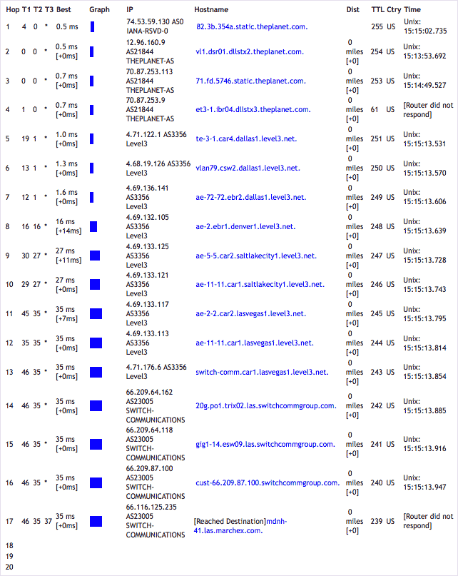 The traceroute we offer is the unification of many steps you could do yourself, if you wanted to take the time and energy. First and sometimes most importantly our traceroutes originate from our datacenters. Many times you are faced with the dilemma, I can get to the site but someone else can’t from where they are. Using our traceroute allows you to test from another location; one that you know should work reliably. But we throw in a whole lot more information just to make your life easier. For example we traceroute with ICMP (T1 column), TCP (T2 column) and UDP (T3 column), each with their own time in milliseconds, we then give you the best time and the incremental time added by that hop. A nice graph of each hop is displayed. We look up the Assigned System Number and Assigned System Name as ARIN understands it, the hostname if it exists, the TTL, the country and report, if we can determine it, the system type and finally the time that that hop thinks it is. Basically this is everything you could ever hope to want in a traceroute tool, easily accessible via a simple web browser or even your WAP enabled phone!