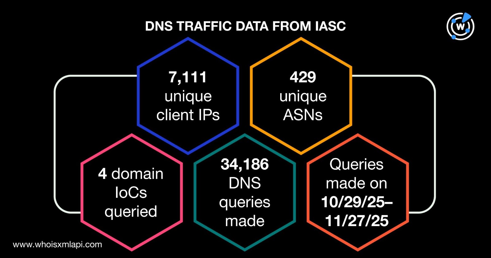 In addition, sample network traffic data from the IASC revealed that 7,111 unique client IP addresses under 429 distinct ASNs communicated with four of the domains tagged as IoCs. Altogether, they made 34,186 DNS queries between 29 October and 27 November 2025.