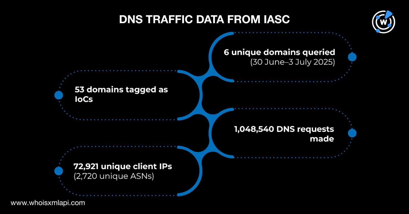 Apart from the WHOIS and DNS record findings we uncovered about the 62 IoCs, we also looked at sample DNS traffic data from the Internet Abuse Signal Collective (IASC) to further analyze the 53 domains tagged as IoCs. The sample data revealed that 72,921 unique client IP addresses tied to 2,720 unique ASNs queried six distinct domains between 30 June and 3 July 2025 via 1,048,540 DNS requests.