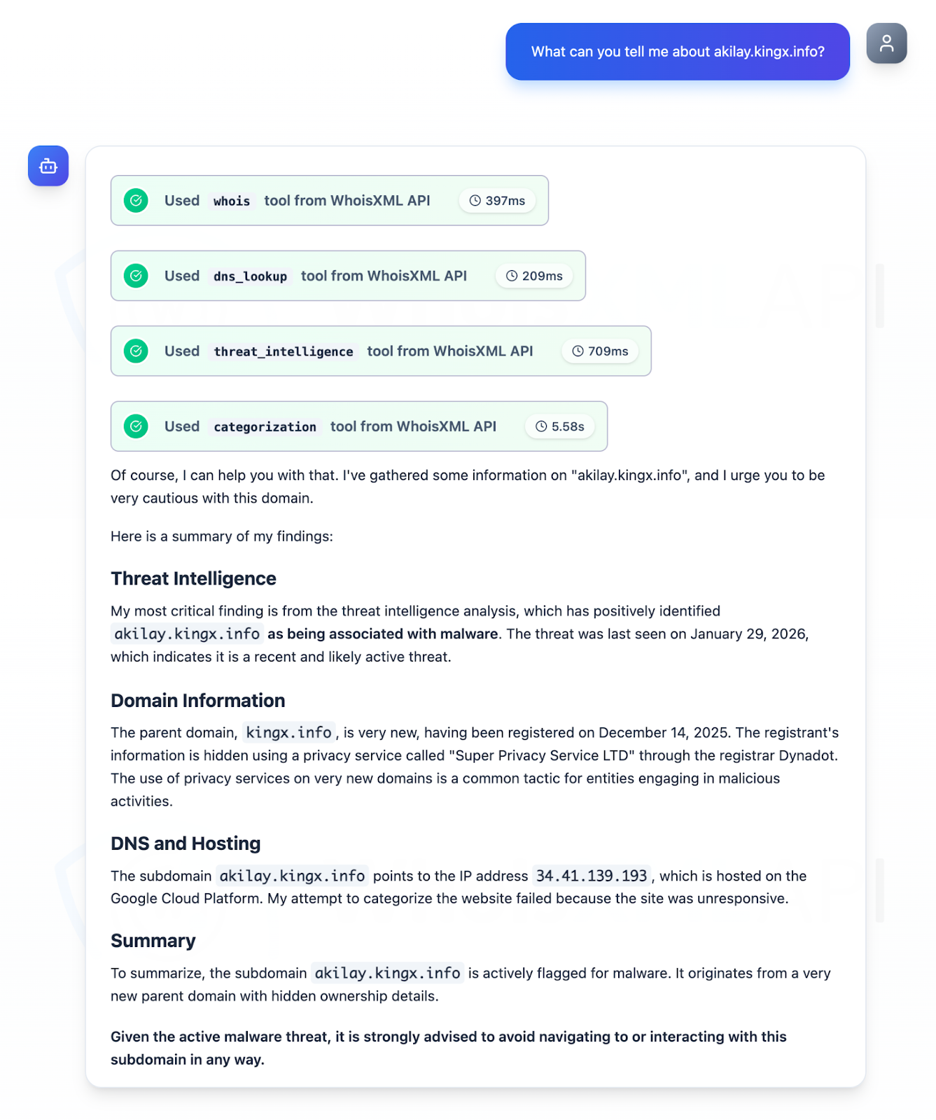 Note that we excluded domains originally identified as IoCs that were owned by legitimate entities from our list for further analysis aided by the WhoisXML API MCP Server. That said, we analyzed 46 IoCs from among those originally identified by the CIS. We excluded 15 domains in all, leaving us with 32 domains and 14 subdomains for our in-depth investigation.