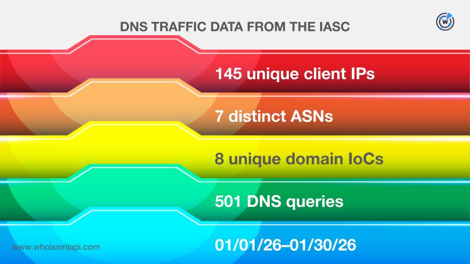 Sample network traffic data from the IASC revealed that 145 unique client IP addresses under seven distinct ASNs communicated with eight of the domains tagged as IoCs via 501 DNS queries between 1 and 30 January 2026.