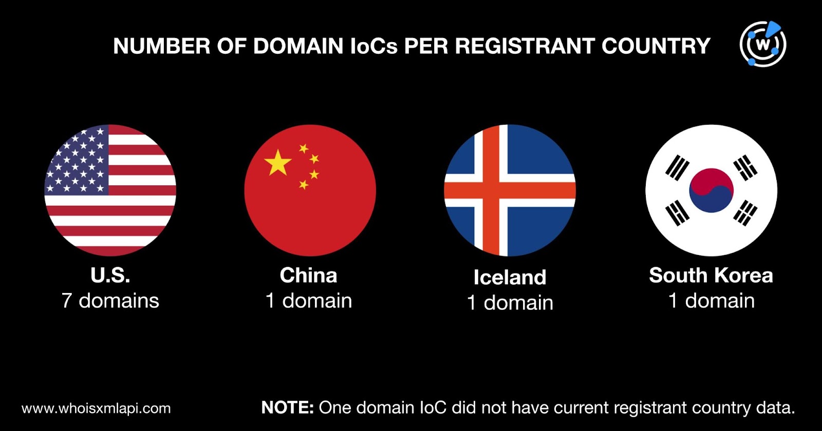 Only 10 of the 11 domains had registrant countries on record. Specifically, they were registered in four countries led by the U.S., which accounted for seven domains. Finally, one domain each was registered in China, Iceland, and South Korea.