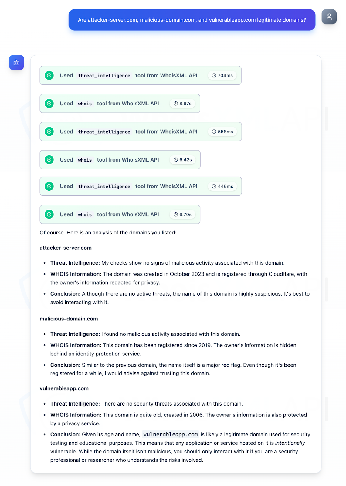 As mentioned earlier, we zoomed in on three domains identified as IoCs in our analysis. Our WHOIS API queries for them revealed that: