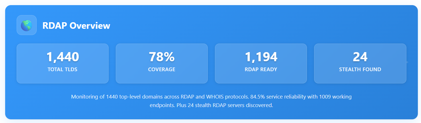 When you open the monitor, you will immediately see the total number of RDAP-ready TLDs against the total number of TLDs it monitors. The overview also displays the number of stealth RDAP servers found, as well as the service reliability percentage of the RDAP endpoints.